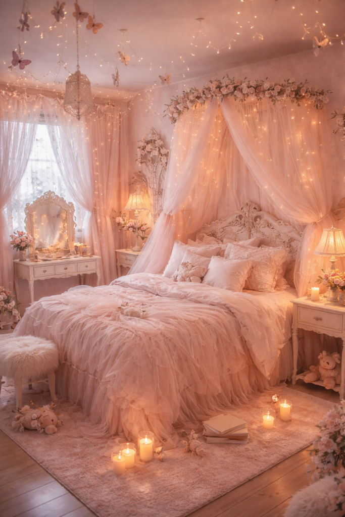 For those who love magic, shabby chic can lean whimsical. A Fairy Like Bedroom with Fairycore Bedroom Pink Aesthetic details—twinkle lights, soft canopies, and delicate decor—creates a dreamy mood.