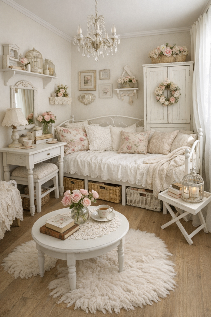 Nothing defines shabby chic quite like florals. Bedroom Decor Floral elements—whether through wallpaper, bedding, or artwork—create softness and movement. Rooms With Flowers feel alive and welcoming, especially when inspired by a Rose Garden Bedroom look.