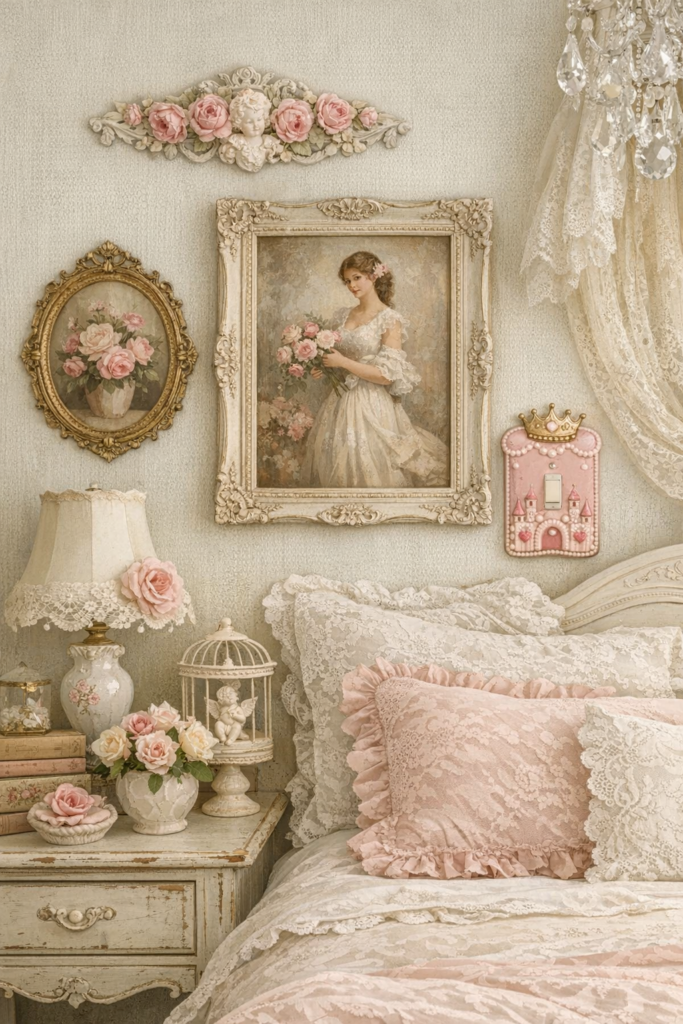 Complete your room with thoughtful accents like Shabby Chic Wall Decor Ideas Bedroom, vintage frames, and floral art. Even small details—like French Chic Light Switch Plate or Princess Room Light Switch Cover—add personality.