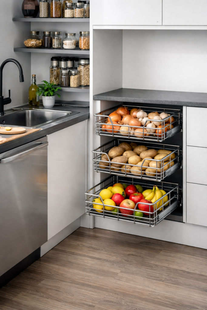 Wire baskets are a stylish and breathable solution for storing potatoes, onions, garlic, and other vegetables. Pull-out wire baskets allow airflow while keeping items accessible.