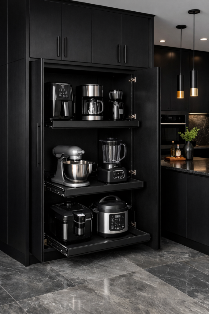 Modern kitchens often include appliances like air fryers, blenders, mixers, and coffee machines. Instead of placing them randomly on countertops, store them inside pull-out shelves.