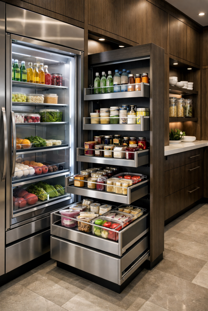 You can create a pull-out storage zone near the fridge, with sliding drawers for drinks, dairy, sauces, and meal prep items. This system makes cooking and organizing groceries extremely efficient.