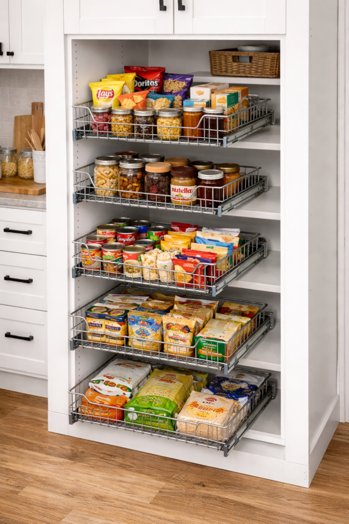 Sliding racks maximize storage while keeping the space open and easy to navigate. You can store canned foods, spices, packaged items, and even cleaning supplies in a structured way.