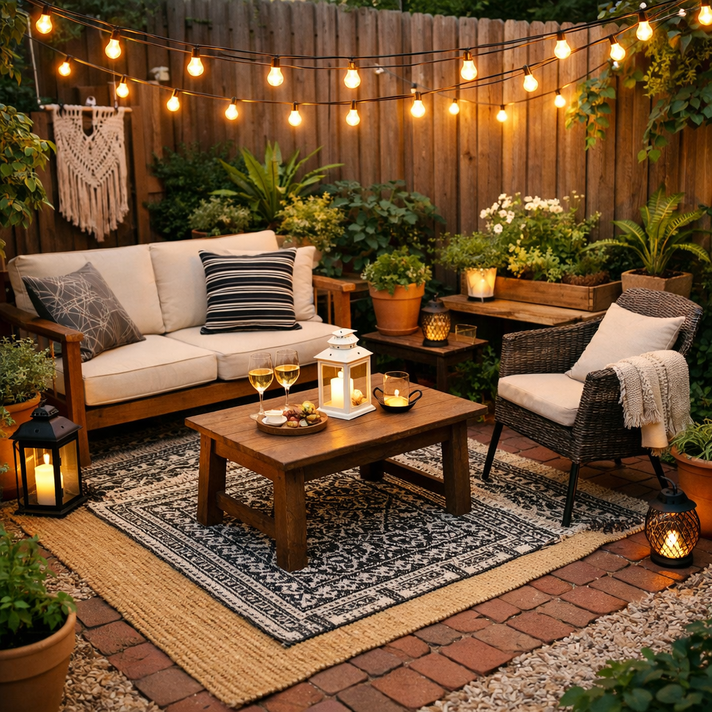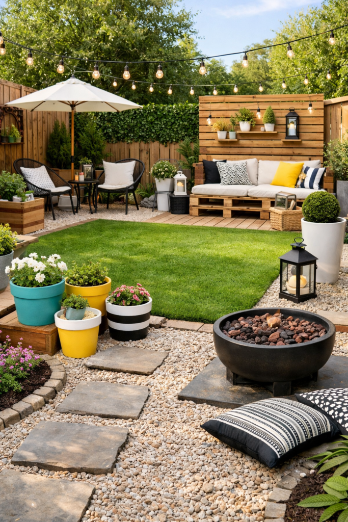 If you’re searching for small back yard ideas on a budget easy patios, start with a simple patio transformation. Think gravel or brick for affordable backyard paver ideas, layered outdoor rugs, and comfy seating.