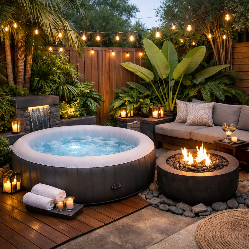 For a luxe feel, combine a Backyard With Jacuzzi And Fire Pit concept — imagine soaking in warm water while the flames flicker nearby.