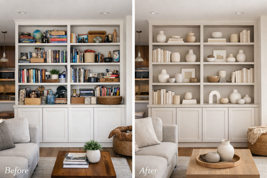 After: Painted soft greige and styled intentionally with books and ceramics.