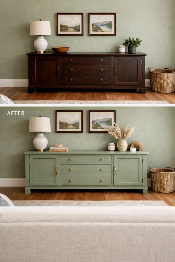 7. Cabinet Refresh with Green Paint for Living Room Walls 🌿