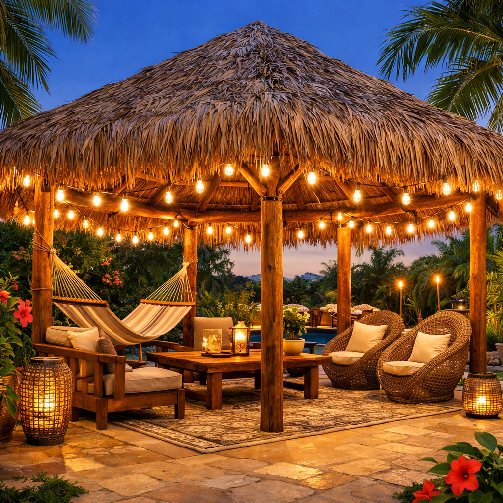 Choose weather-resistant outdoor palapa furniture like wicker chairs, bamboo tables, and cushioned loungers.
