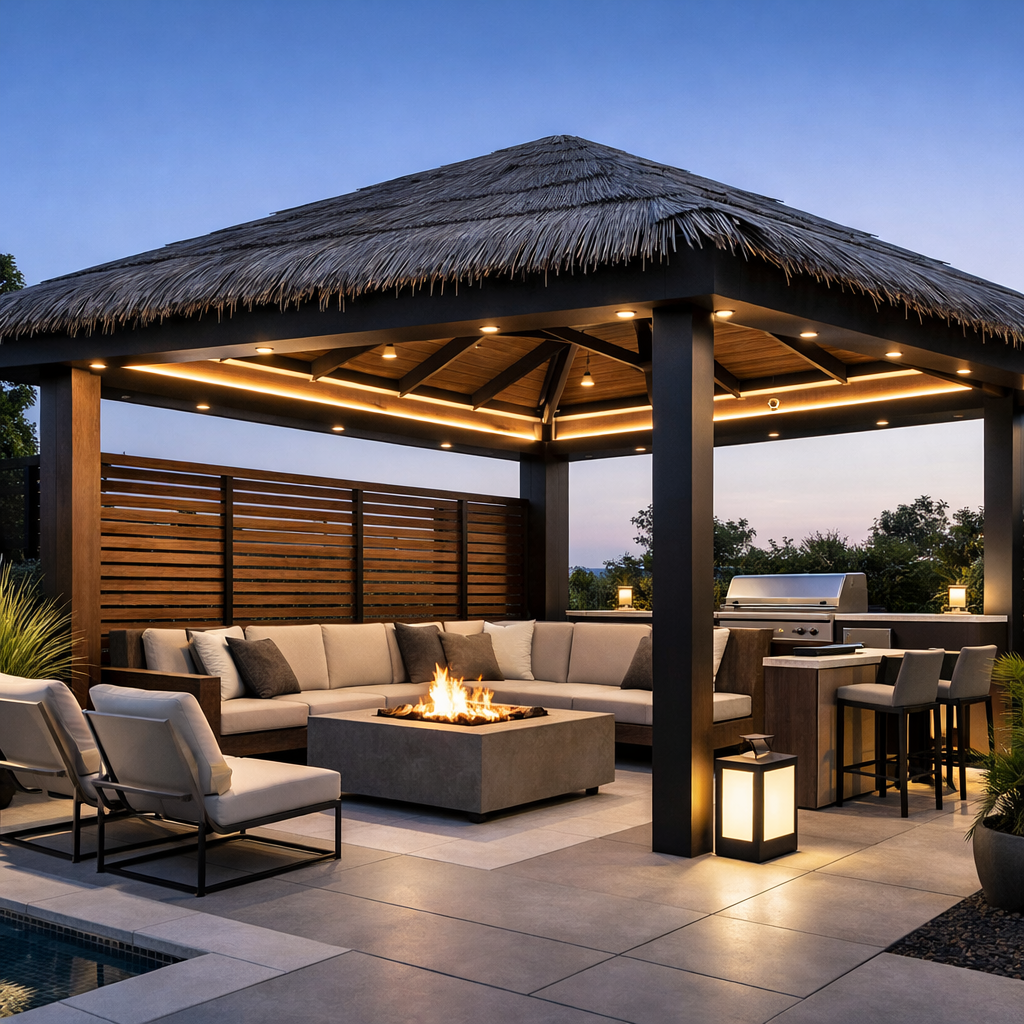 A backyard pergola palapa hybrid can blend tropical style with modern architecture.