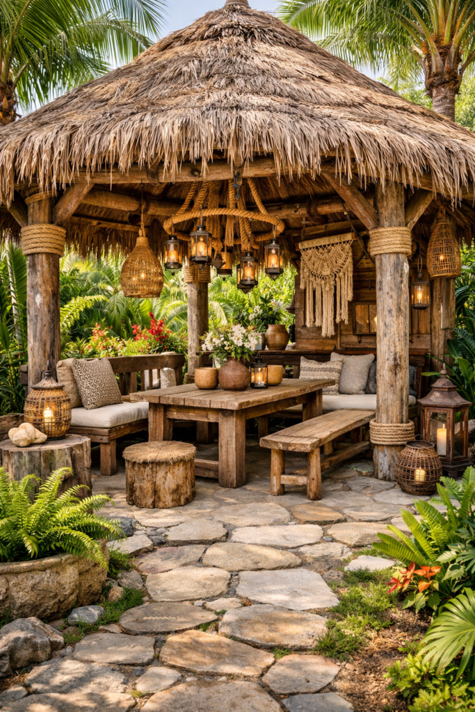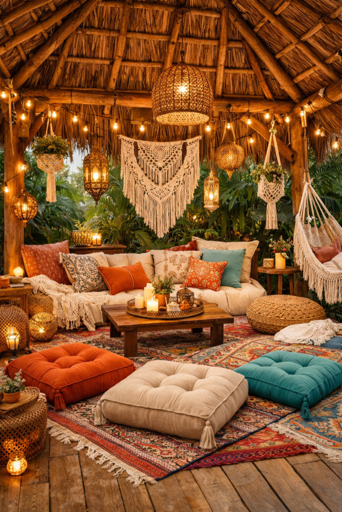 A boho backyard palapa is all about comfort and creativity. Think layered textiles, lanterns, and cozy seating.