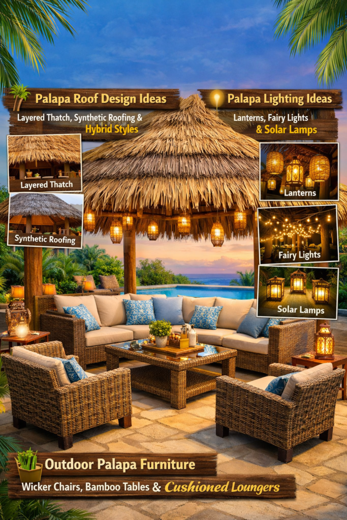Explore different palapa roof design ideas, including layered thatch, synthetic roofing, or even hybrid styles for durability.