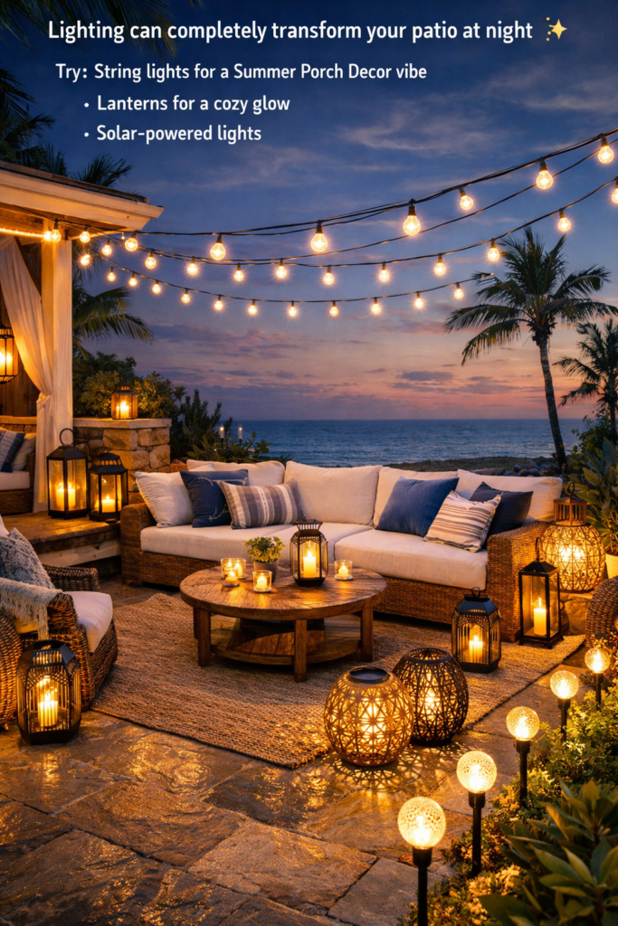 Start with a soft, calming base using Coastal Colors like white, sandy beige, and light blue patio decor. These tones instantly bring in Ocean Vibes and make your space feel open and airy.