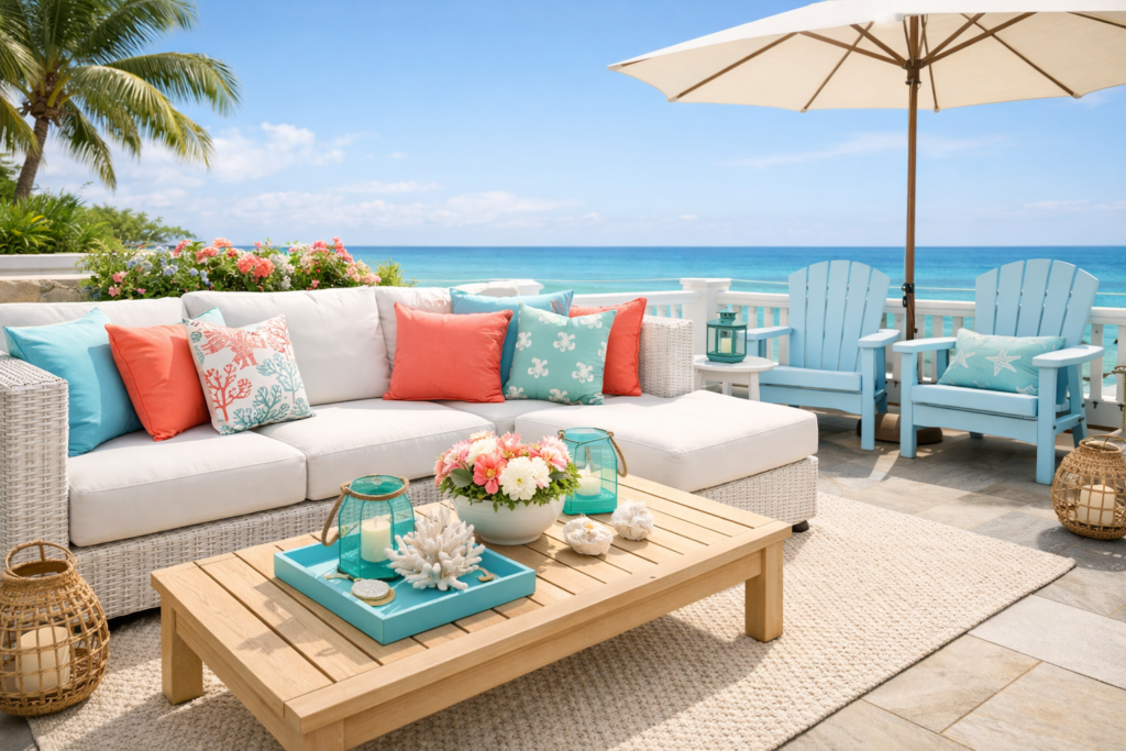 Add pops of coral, turquoise, or seafoam green for a Colorful Outdoor Beach Decor look. This works beautifully for both Modern Coastal Patio Decor and rustic styles.