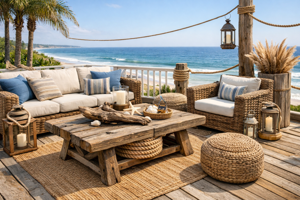 Nothing says Beach Living like weathered wood and organic textures. Use driftwood, rattan, or reclaimed materials for that Rustic Coastal Patio Decor feel.