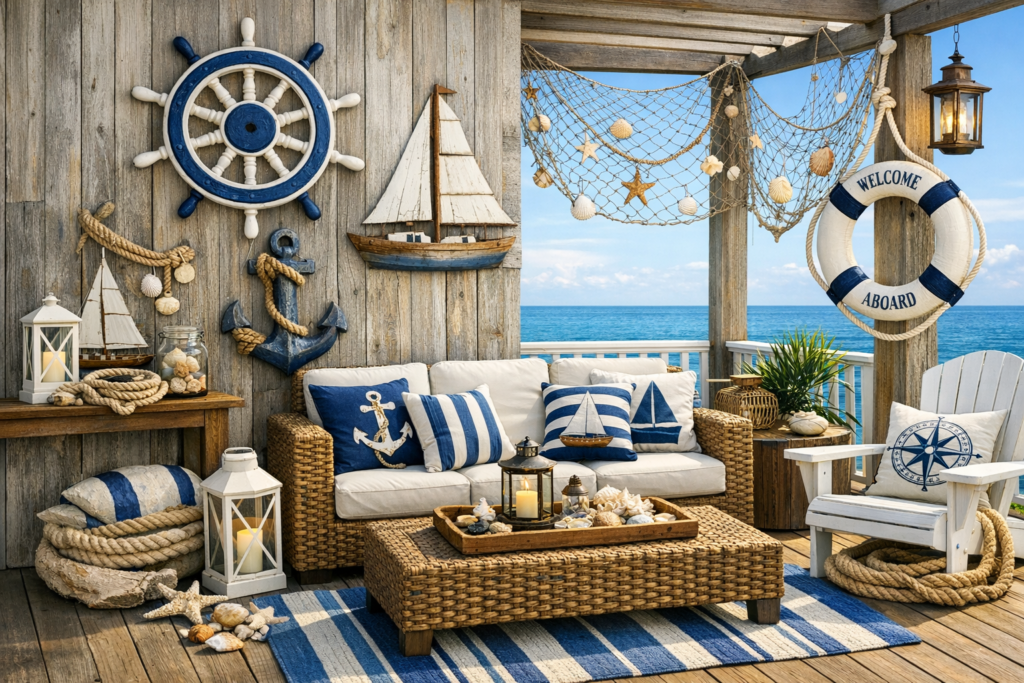 Add charm with Nautical Outdoor Decor like anchors, ropes, and shells.