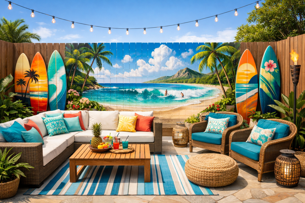 Make your patio stand out with a Colorful Surfboard Mural On Fence or a painted ocean scene. An Outdoor Patio With Beach Mural instantly transforms your space into a tropical paradise.
