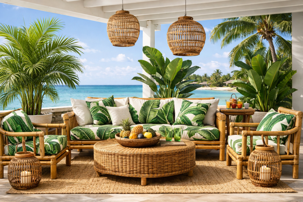Bring in Tropical Beach Patio Decor with palm prints, bamboo furniture, and leafy plants. This works great for a Palm Beach Chic or Caribbean Home Decor style.