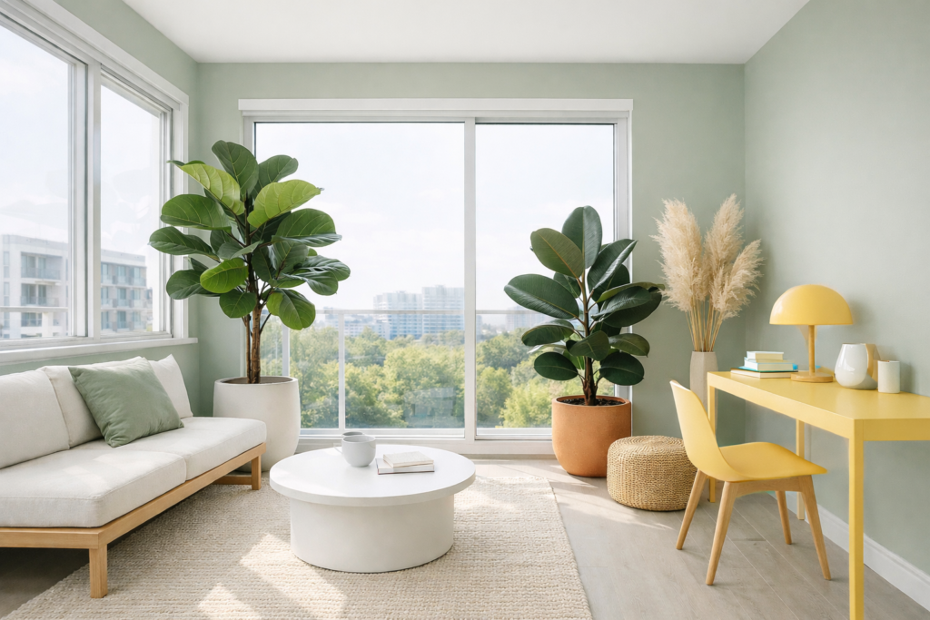 A Minimalist Sunroom doesn’t mean boring—it means intentional. Choose 2–3 statement plants like a fiddle leaf fig or rubber plant.