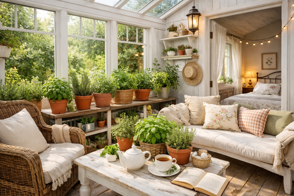 🌼 5. Cottage-Inspired Sunroom with Herbs