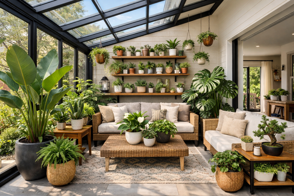 🌱 11. Sunroom Attached to House with Mixed Plant Layers