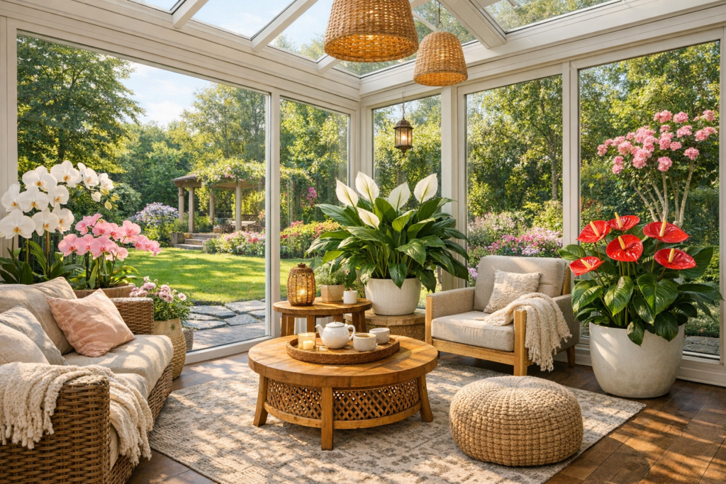 🌸 3. Cozy Sunroom With Garden View + Flowering Plants