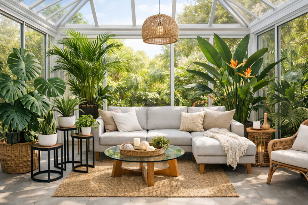 Turn your Modern Conservatory Living Room into a tropical paradise with plants like monstera, areca palm, and bird of paradise. These bold greens thrive in bright light and instantly elevate your Sunroom Modern vibe.