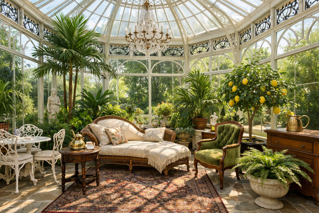 Channel timeless elegance in a Victorian Conservatory Sunroom with classic plants like ferns, palms, and citrus trees.