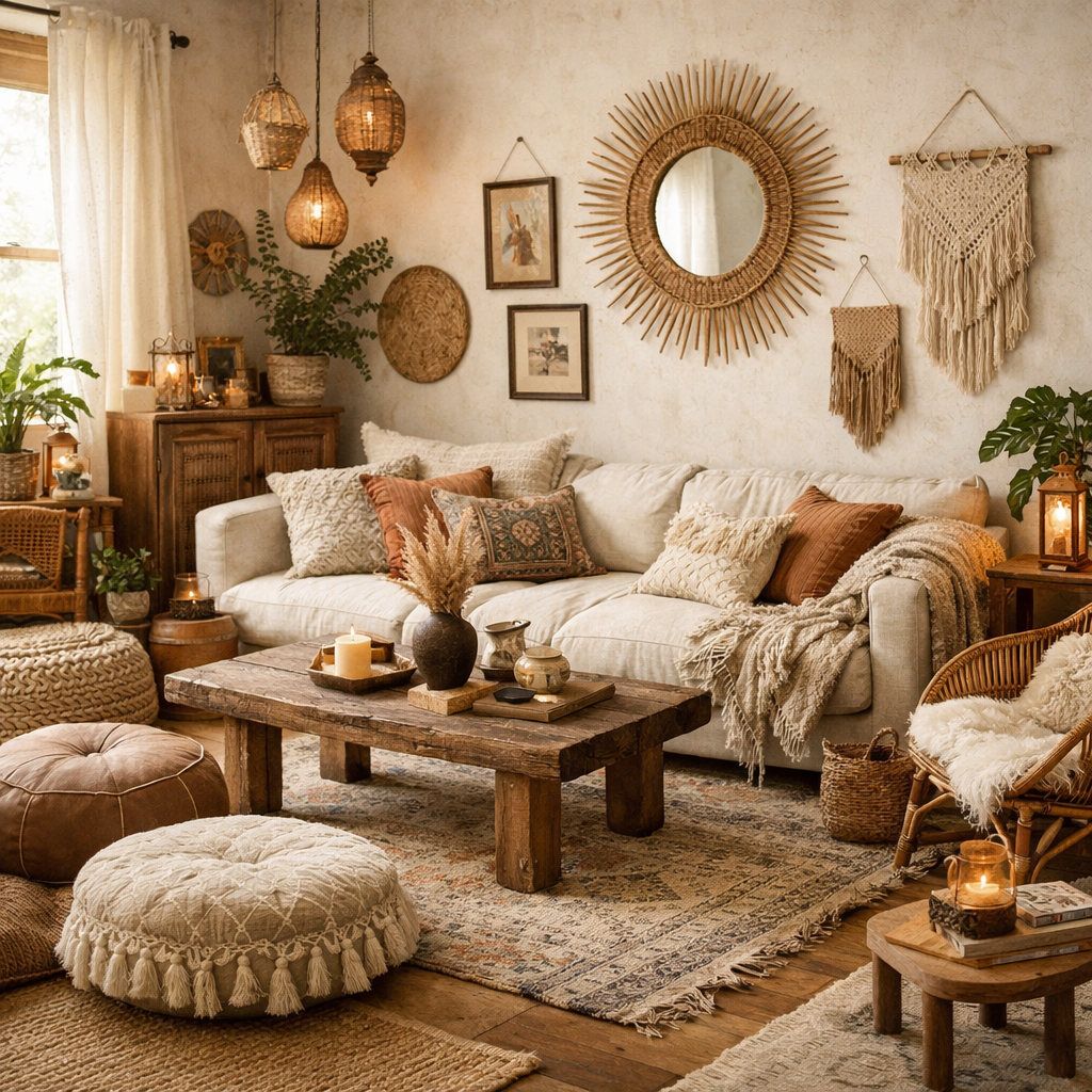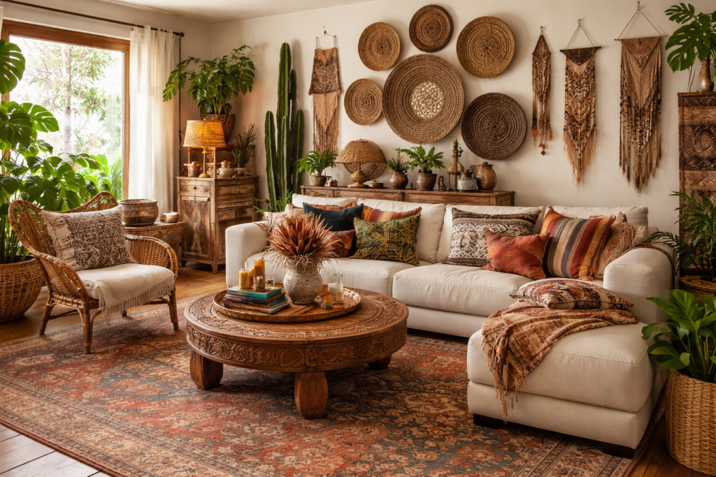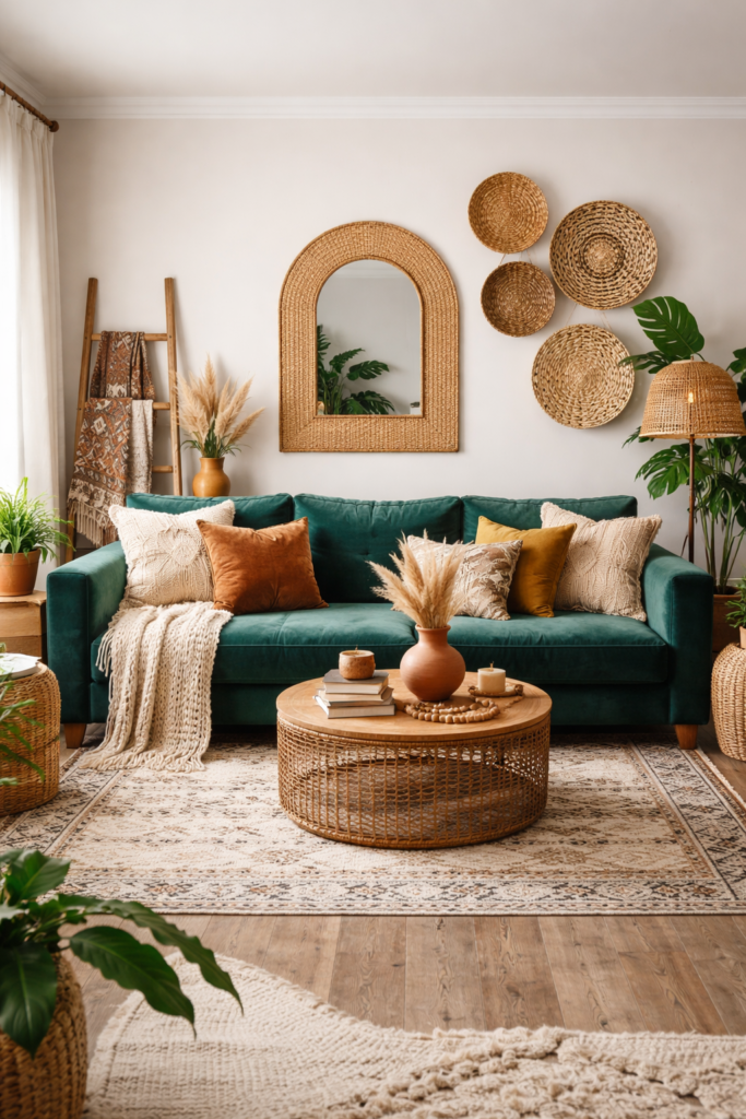 True boho homes reflect personality. Mix Bohemian Decor Style elements with African Bohemian influences, handcrafted ceramics, and travel finds. A Living Room Boho Eclectic layout feels curated yet relaxed. This approach works equally well in a Modern Boho Living Room Apartment or a more traditional home.