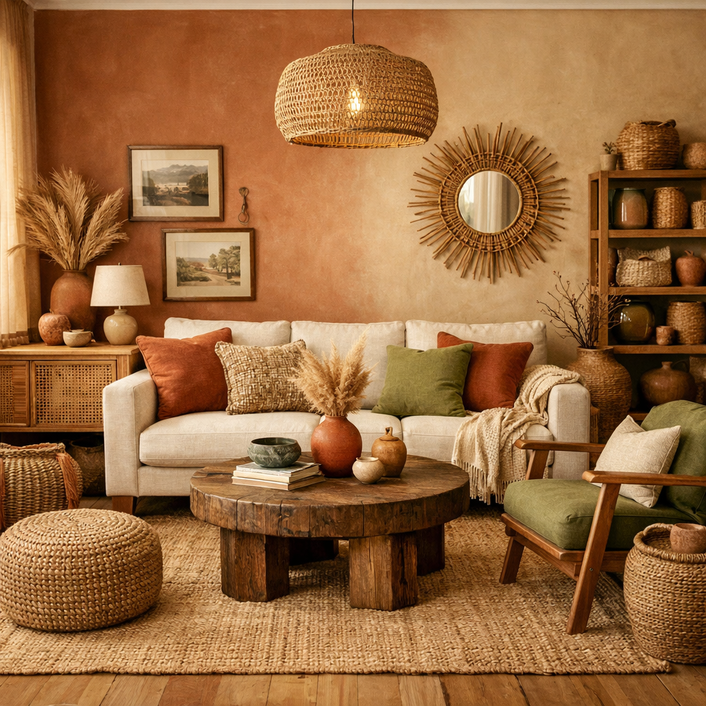 Earthy colors are essential for grounding boho spaces. Use terracotta, sand, olive, and clay shades to create a Homey Aesthetic Living Room. Pair Earth Tone House Decor with Living Room Natural Wood, woven baskets, and linen upholstery for a warm, organic feel. This approach works beautifully for a Living Room Earthy Modern or even an Earthy Retro Living Room with subtle vintage flair.