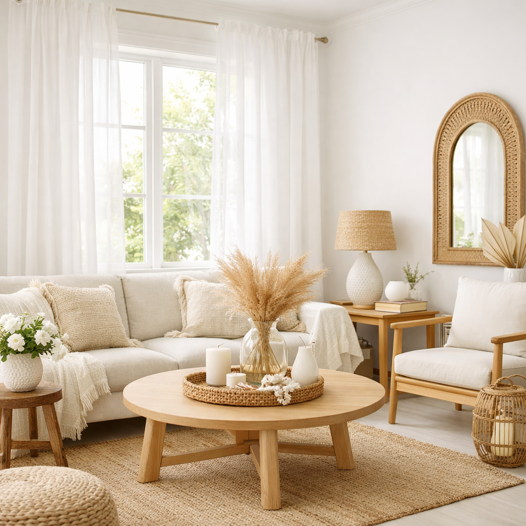 A Boho Light Living Room thrives on natural light. Sheer fabrics, white walls, and reflective accents help achieve a Living Room Light And Airy feel. Styling White Curtains In Bright Room setups with Light Airy Curtains or White Sheer Curtains With Vase accents enhances that relaxed, breezy vibe—perfect for a Neutral Bright Living Room.