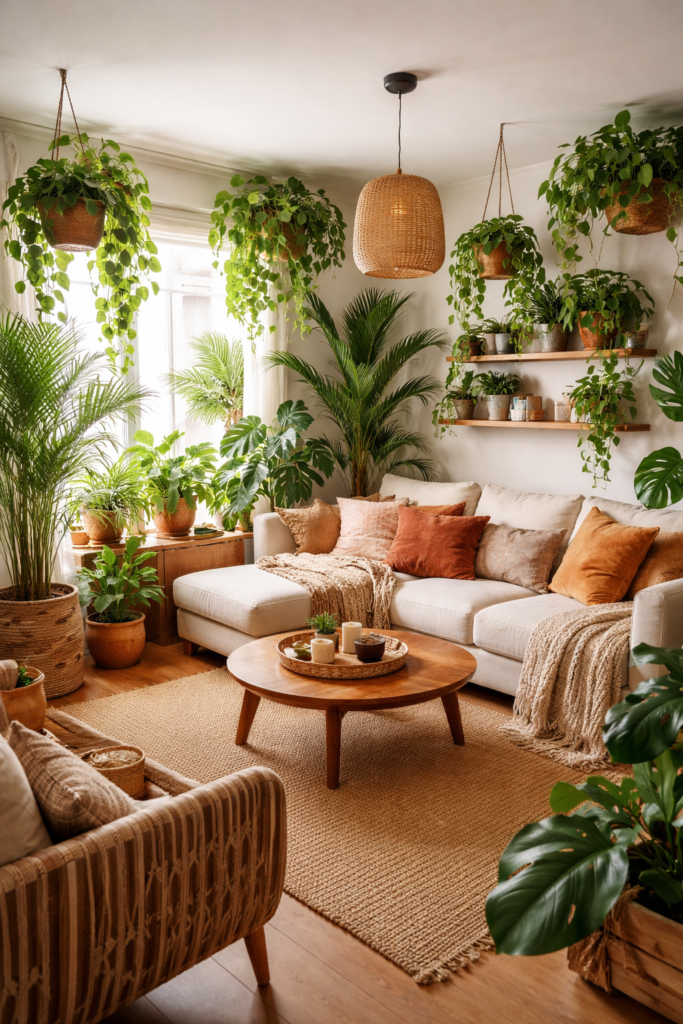 No boho space is complete without greenery. A Lots Of Plants Living Room instantly feels alive and nurturing. From hanging pothos to floor palms, Plant Decor In Living Room designs add texture and color while reinforcing an Earthy Living Room aesthetic. This approach suits both Outdoorsy Style Apartment layouts and cozy urban homes.
