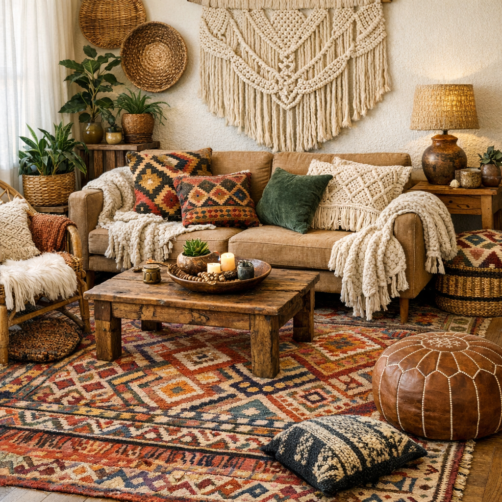 Textiles define boho comfort. Use Living Room Textiles like macramé, kilim cushions, and chunky throws to create depth. A Bohemian Living Room Rug or Colorful Living Room Rug anchors the space beautifully. Layering patterns enhances a Modern Cozy Aesthetic while keeping the room visually warm.