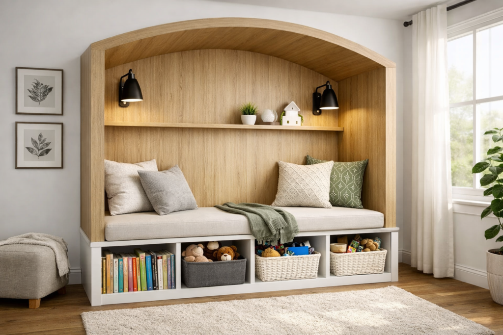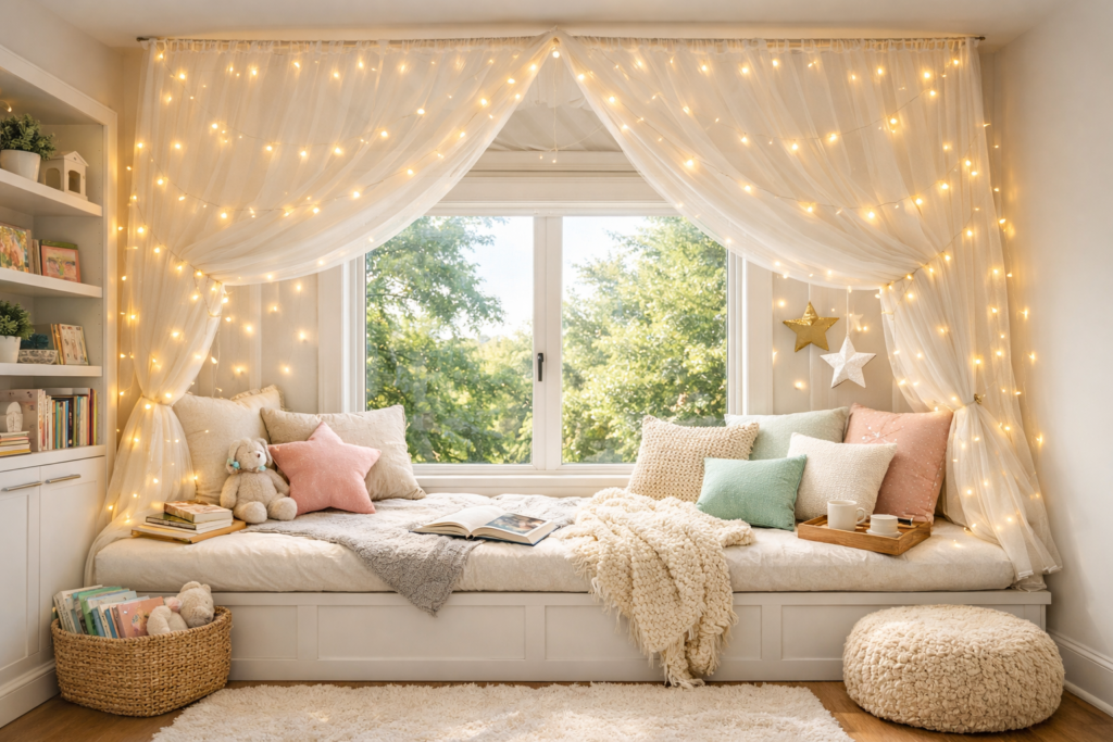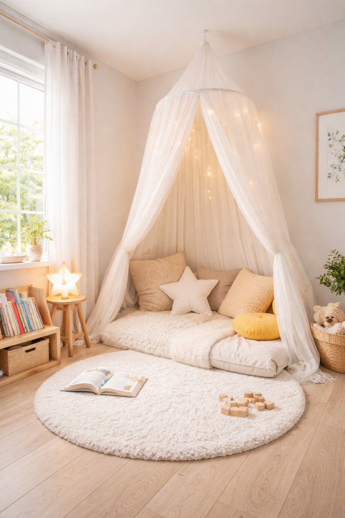 A soft, flowing canopy draped over a quiet corner creates an instant Cozy Reading Nook Kids will love. Add floor cushions, a small rug, and a few favorite books to build a peaceful Kids Cozy Reading Nook.