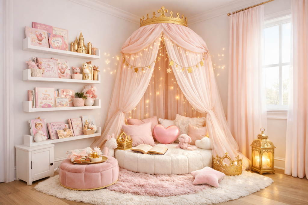 For a magical, dreamy look, go with a princess-style canopy. Think soft pinks, gold accents, and plush seating—perfect for a Girl Reading Nook or Big Girl Bedrooms.