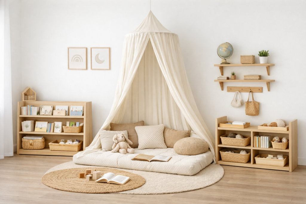 If you prefer a clean and simple aesthetic, a Montessori-style nook is perfect. Use low shelves like a Bookcase For Bedroom, neutral tones, and a small canopy for a calm environment.