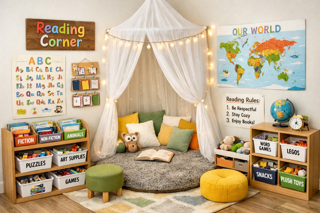 Bring school vibes home with a Cozy Corner Ideas Classroom setup. A canopy adds softness while creating a defined reading space.