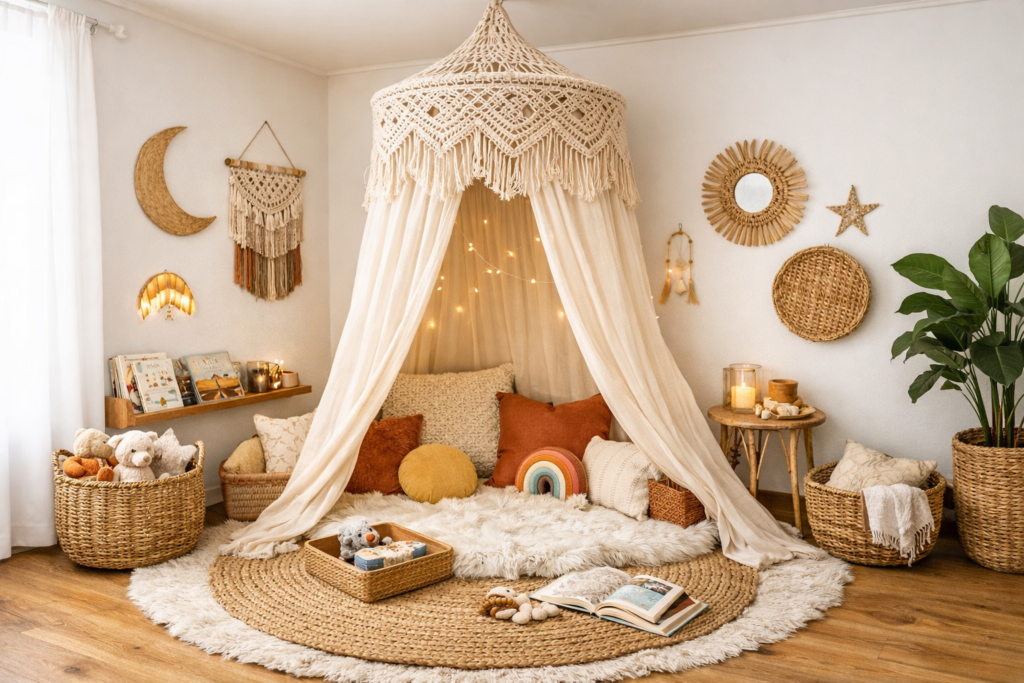 A boho-style canopy nook blends textures, warm tones, and relaxed vibes—ideal for a Boho Toddler Room Decor or Kids Rooms Inspo theme.