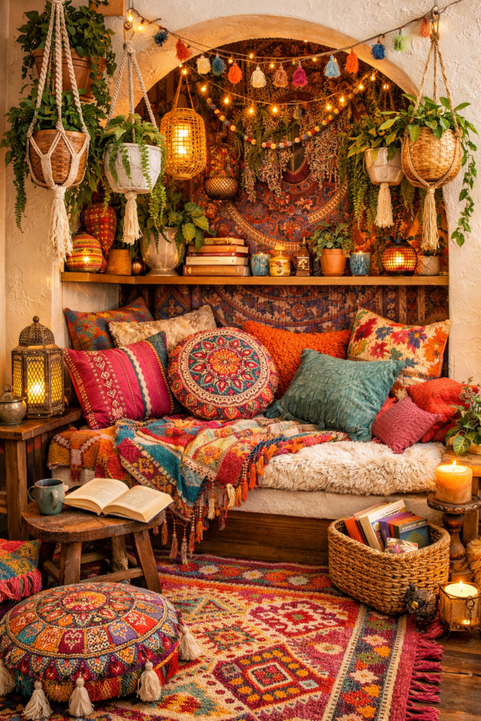 A colorful boho alcove reading nook mixes patterns, plants, and layered textures. This style creates an artistic aesthetic reading nook corner.