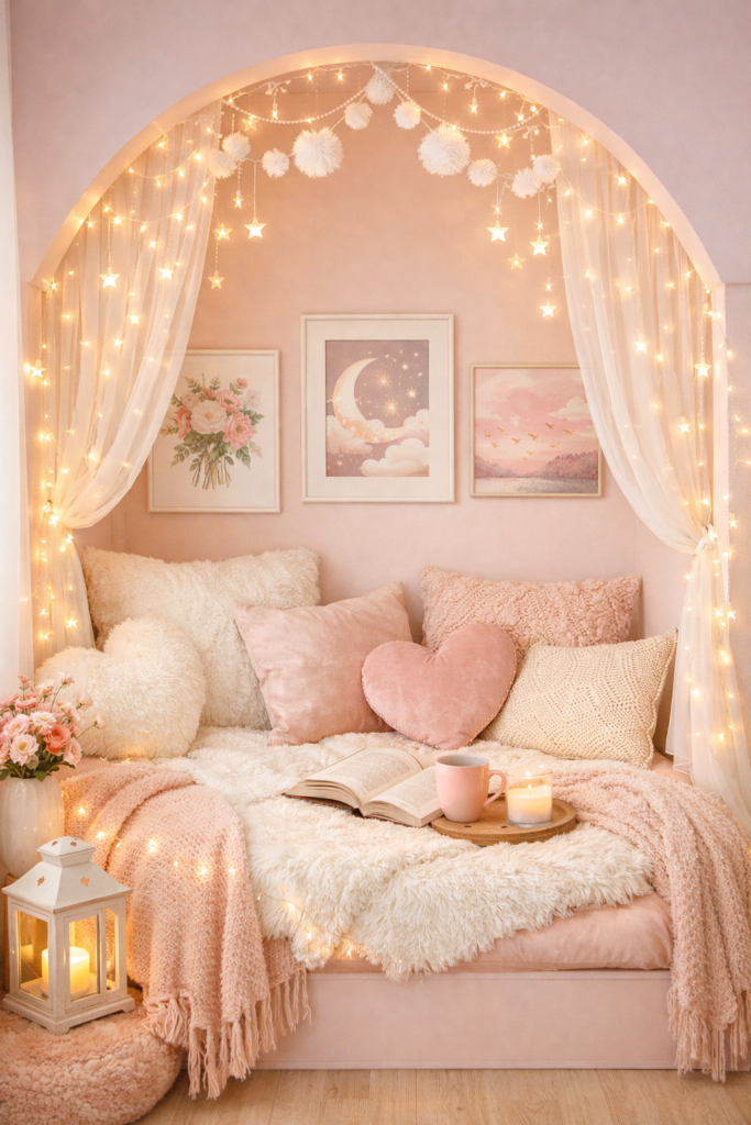 4. Pastel Pink Bedroom Alcove Reading Nook 🌸