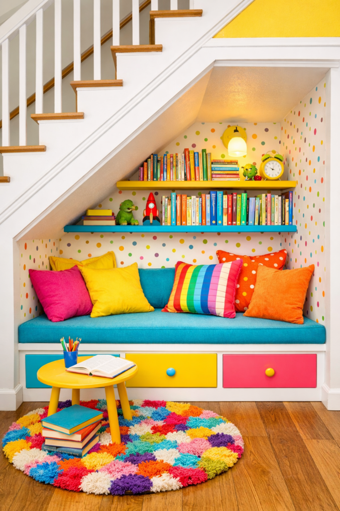 9. Colorful Under Stair Alcove Reading Nook 📚
