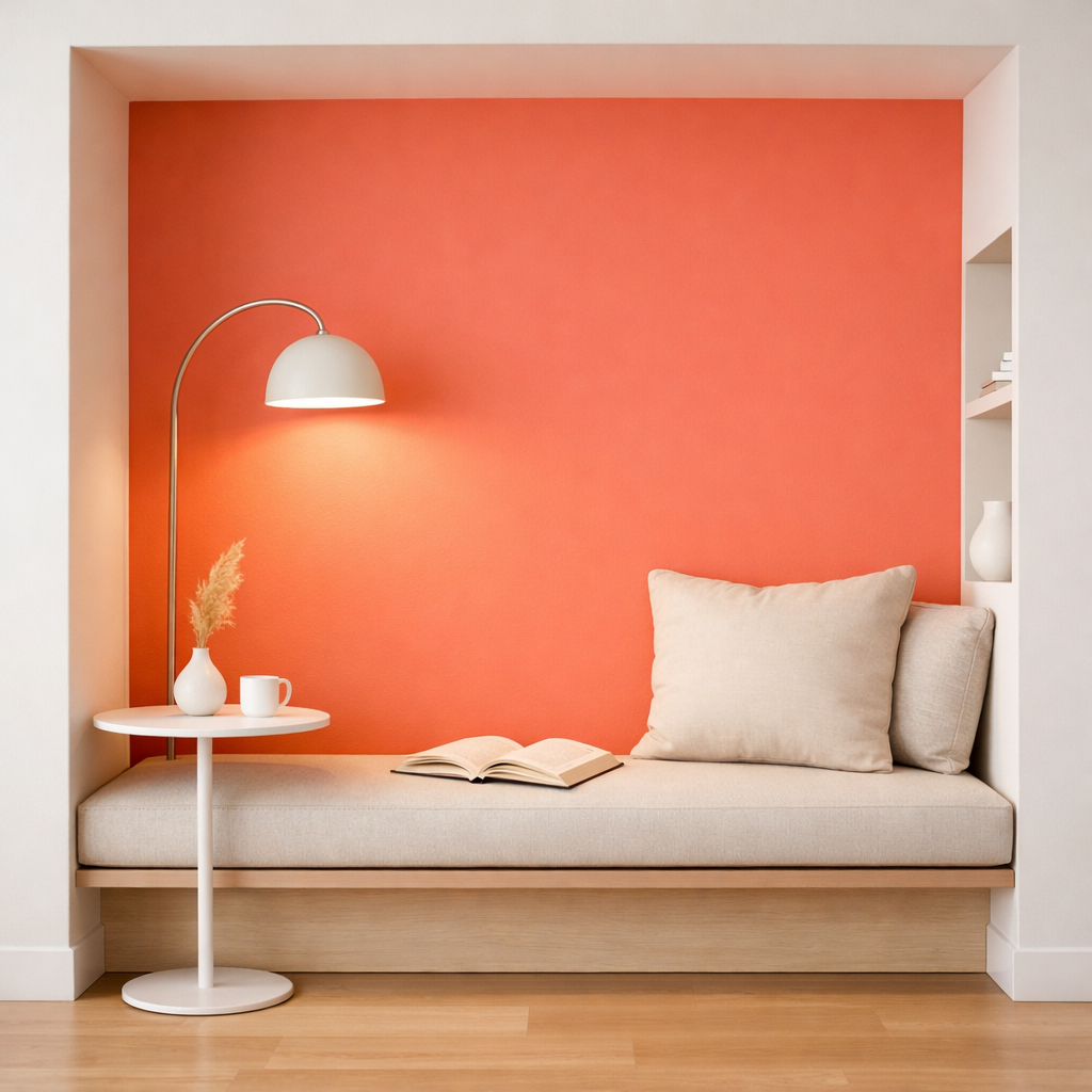 A coral accent wall adds energy to a modern alcove reading nook while keeping the space simple.