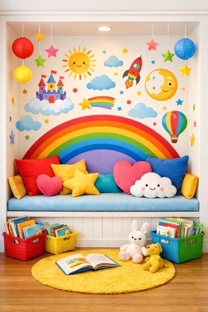 A colorful kids alcove reading nook filled with bright cushions and playful decor encourages reading.