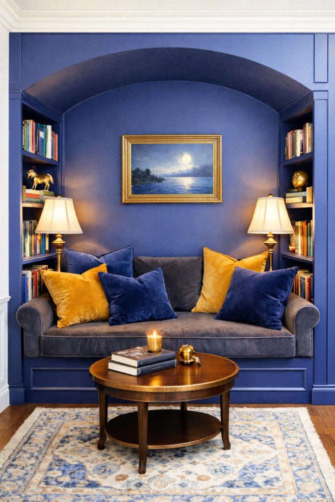 11. Navy Blue Living Room Alcove Nook Ideas 🌌
