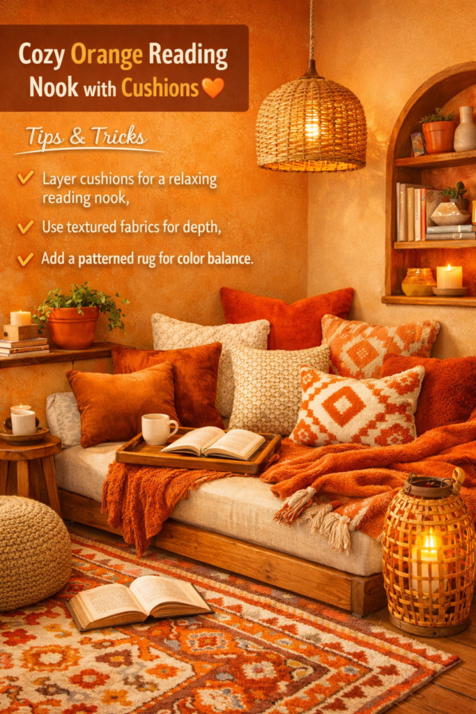 12. Cozy Orange Reading Nook with Cushions