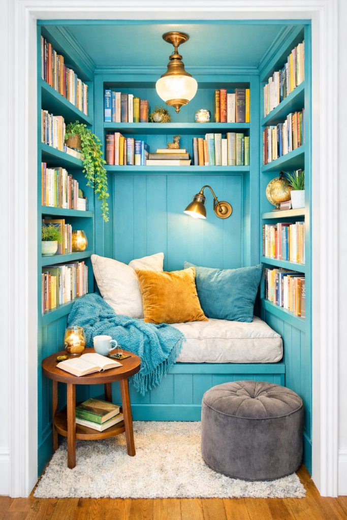 A teal-colored hidden reading nook idea can feel like a secret retreat.
