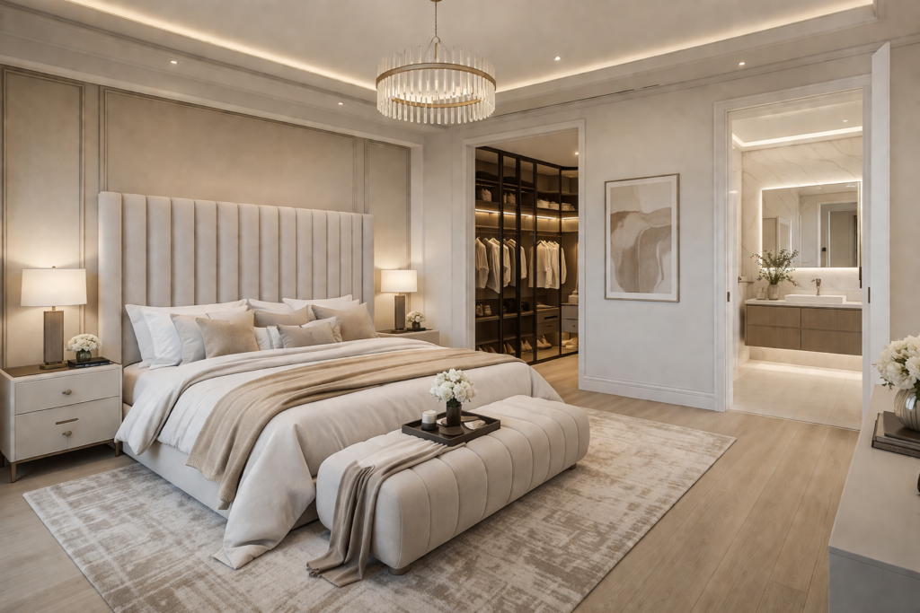 • Luxury bedroom with warm lighting