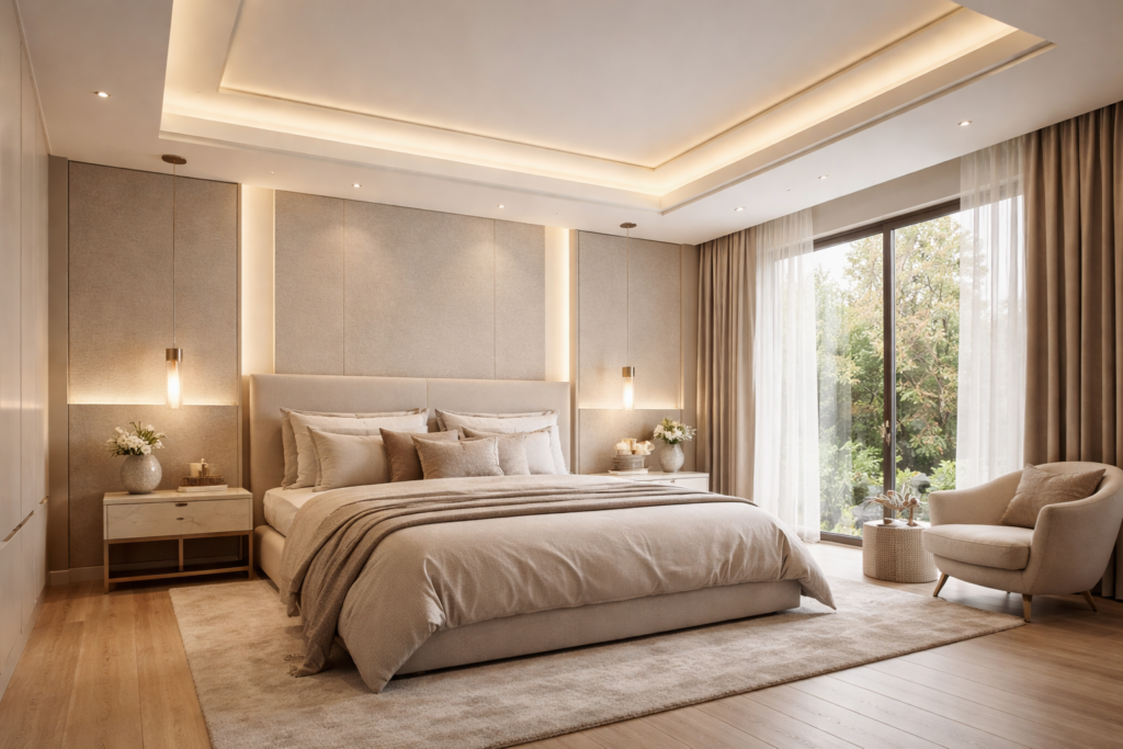 A subtle modern bedroom ceiling design master suite or minimalist false ceiling design can make the whole room feel tailored. You do not need anything overly dramatic. Even a simple recessed cove with hidden warm LEDs looks classy.