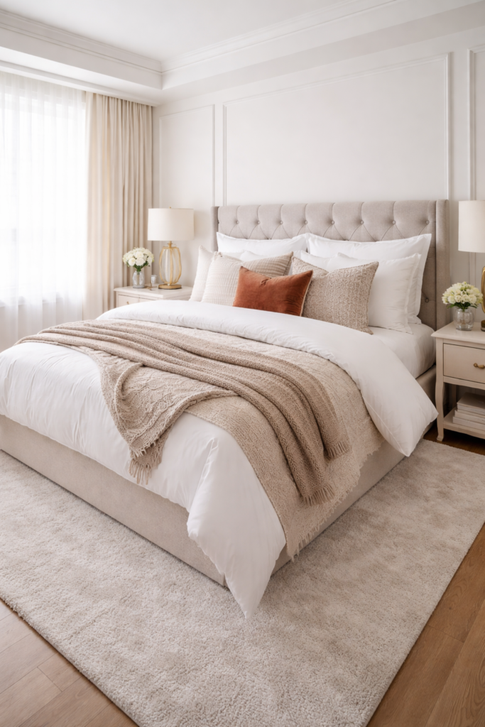 Choose a rug large enough that both sides of the bed still land on it. Tiny rugs kill the luxe vibe fast.