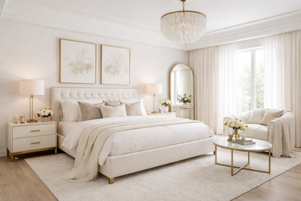 A bedroom white and gold palette can look gorgeous when handled carefully. The key is to keep the gold subtle: lamp bases, drawer pulls, picture frames, or a slim mirror edge. Too much metallic shine and the room starts looking staged rather than luxe.