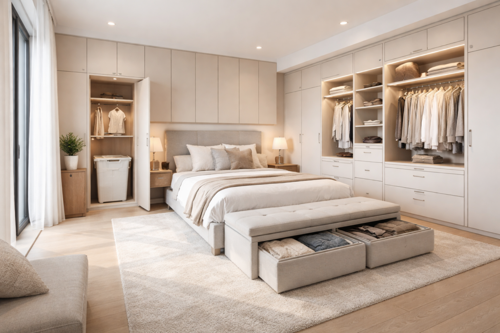 You know what instantly destroys a classy bedroom? Visual chaos. Piles of clothes, random cables, too many baskets, nowhere to hide everyday things.